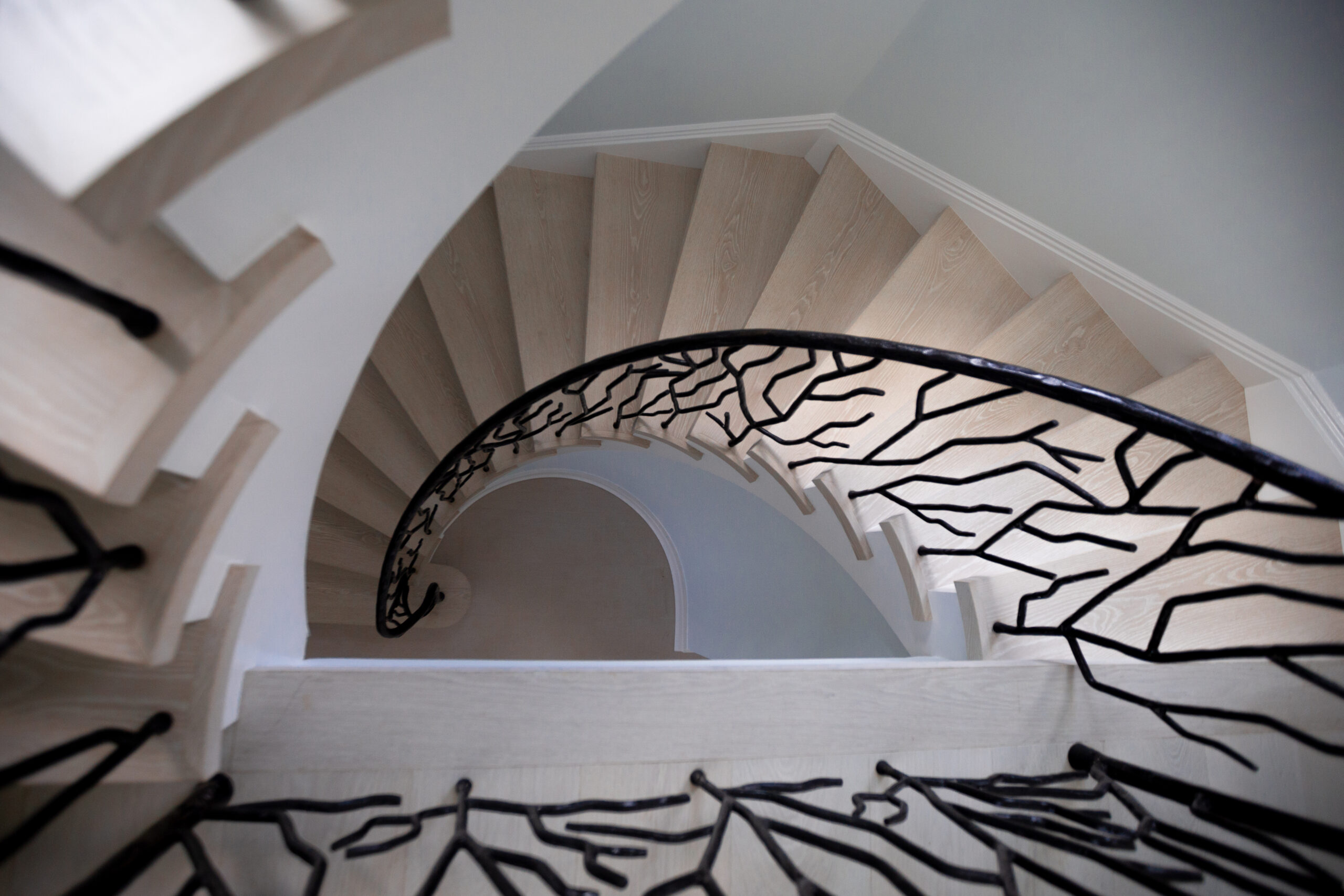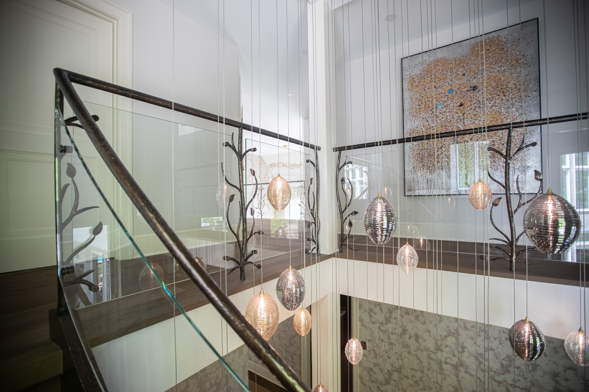 hand-forged wrought iron with the refined beauty of crystal-clear glass. Inspired by natural, organic forms, the custom railing features intricately sculpted branches and leaves, expertly integrated with sleek glass panels to create a harmonious