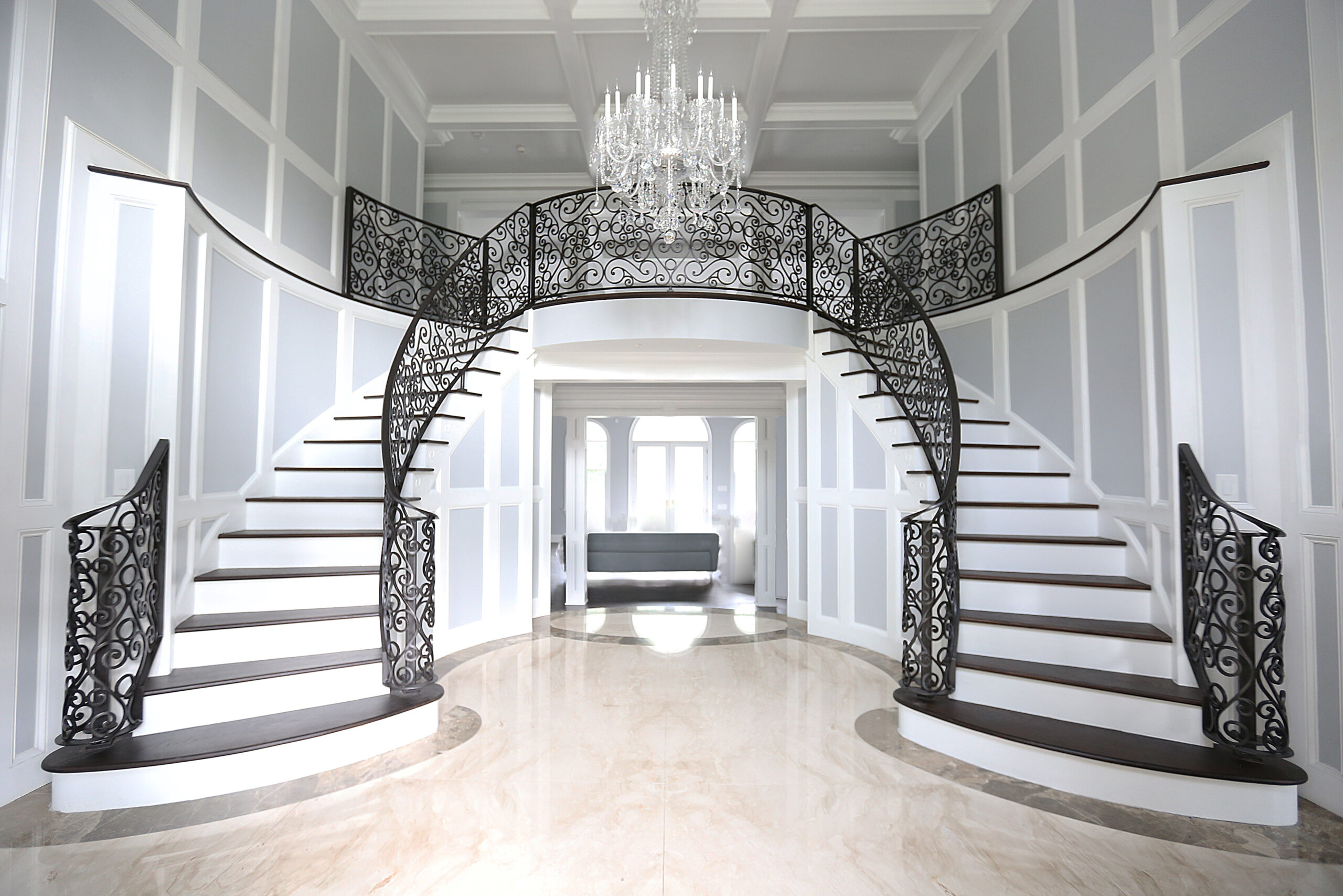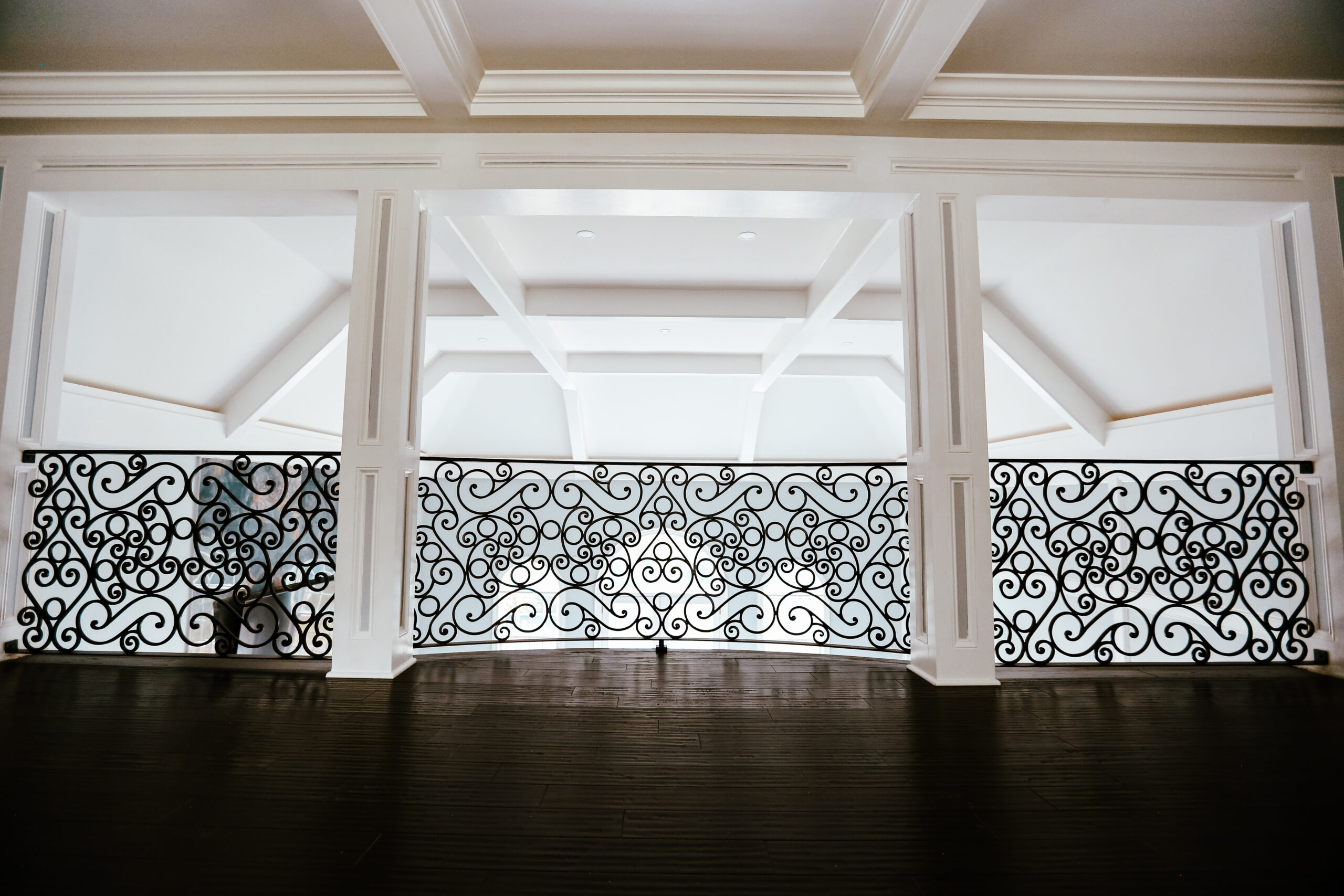 A beautifully crafted iron railing featuring intricate scrollwork that seamlessly blends modern aesthetics with classic elegance.